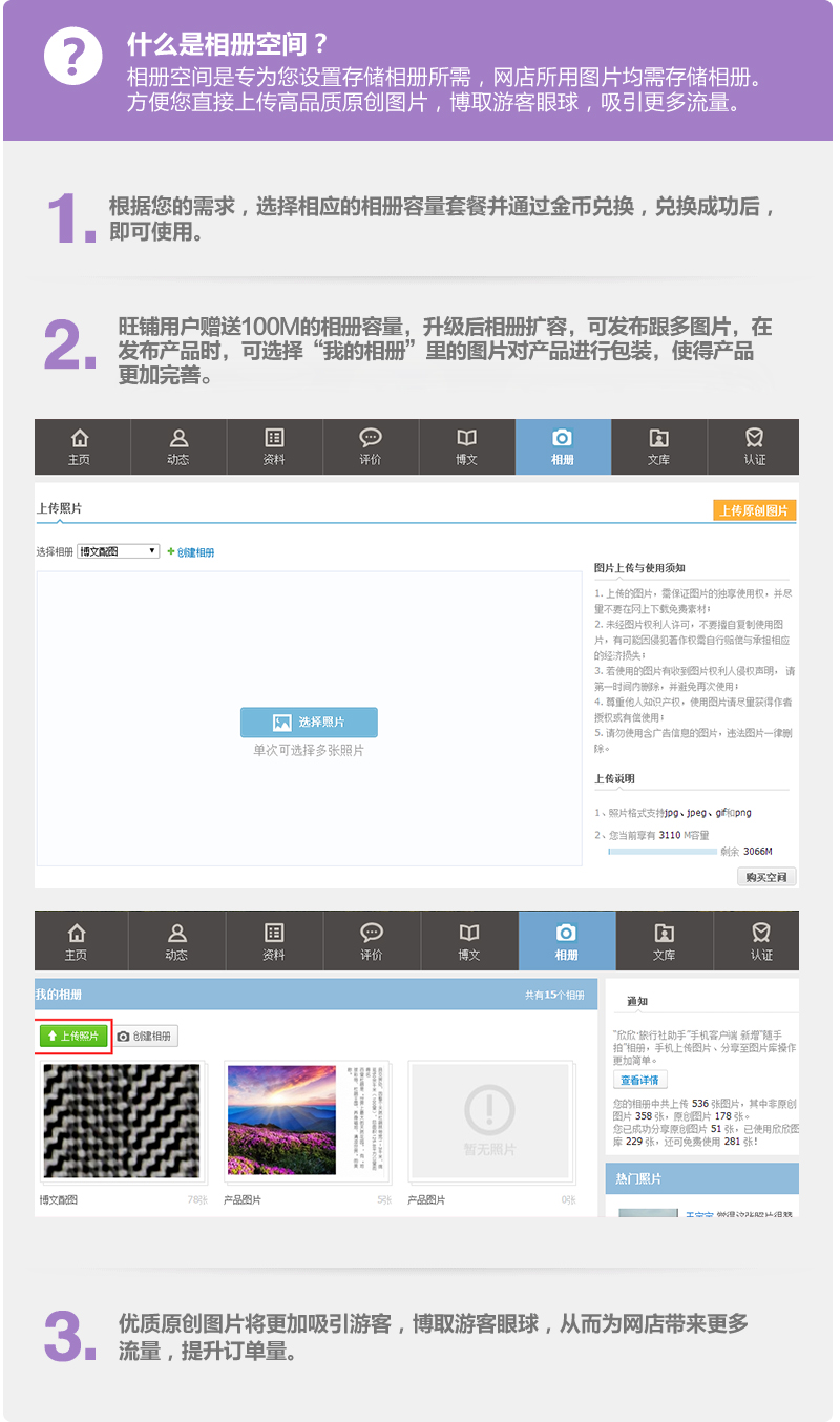 相册空间是专为您设置存储相册所需,网店所用图片均需存储相册。方便您直接上传高品质原创图片,博取游客眼球,吸引更多流量。