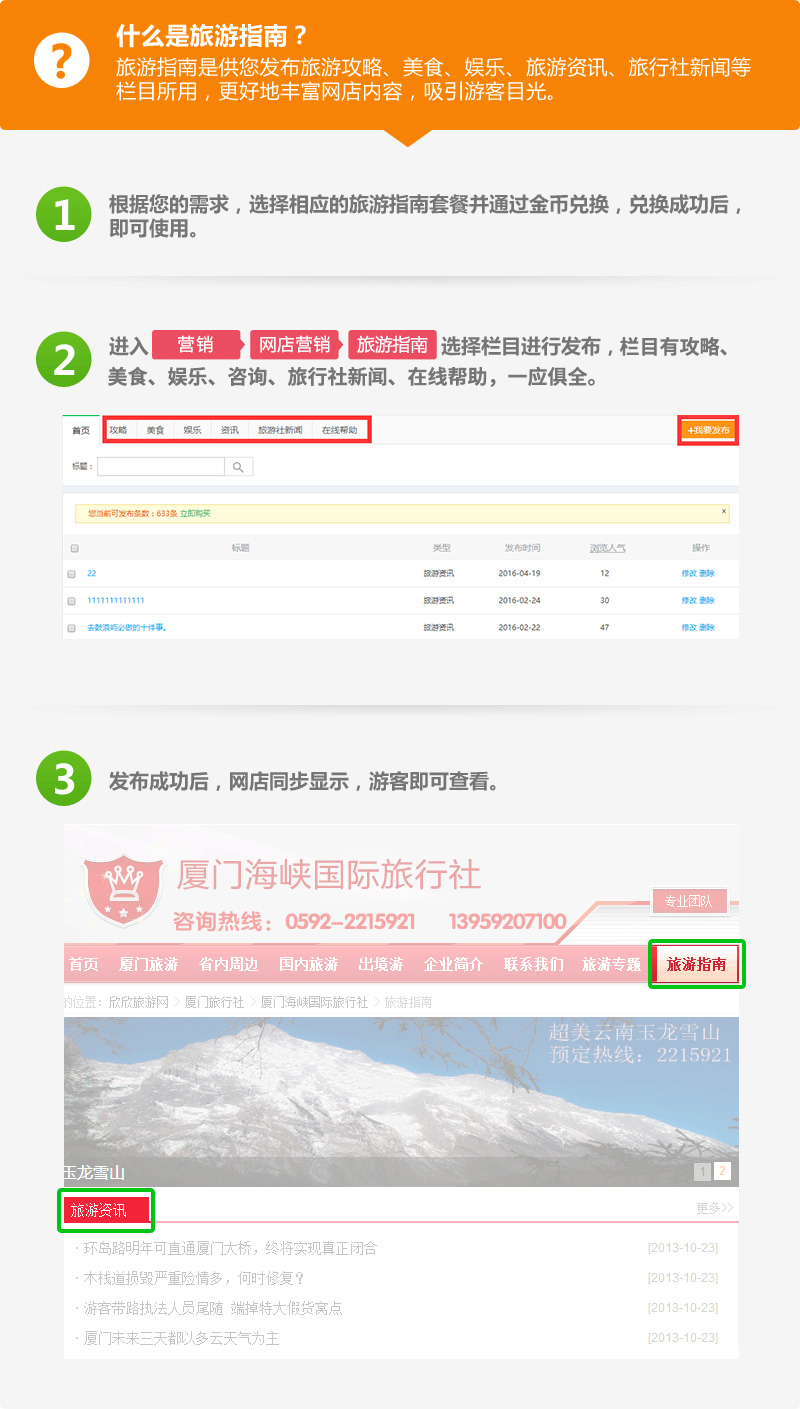 升级网店旅游指南容量能够发布更多旅游指南、资讯、攻略等,更好地丰富网店内容,吸引游客目光!